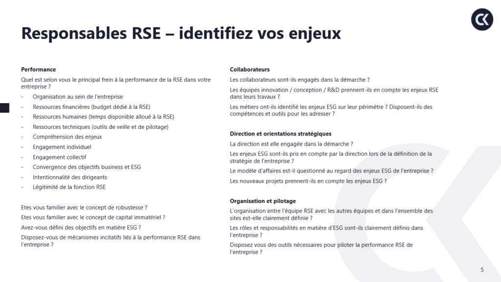 Faites le test pour identifier les freins et leviers de la performance de la fonction RSE dans votre entreprise : modèle opérationnel, création de valeur, les deux ? quels sont vos enjeux pour améliorer votre performance ?